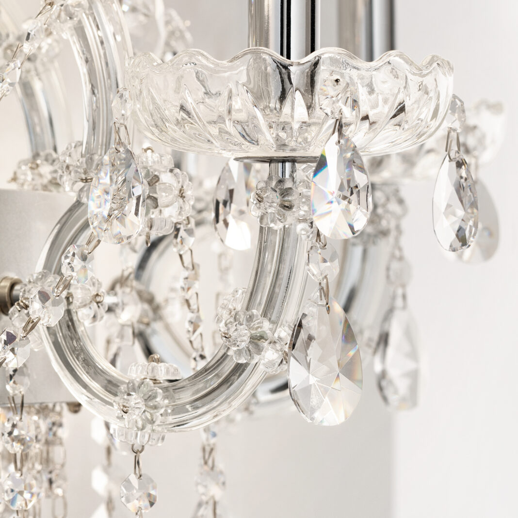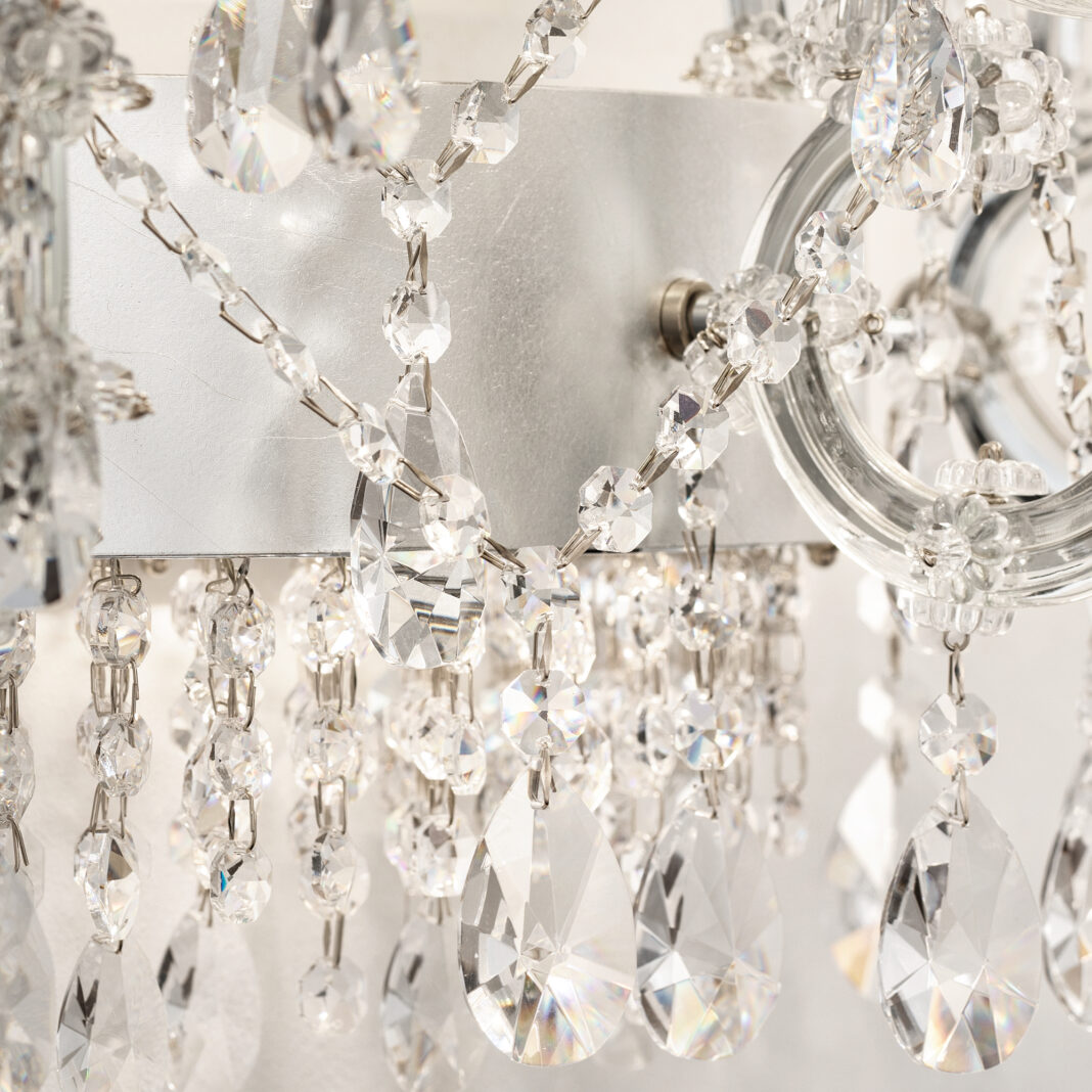 Elevating any space with sophistication. Its galvanised metal oval frame in a silver leaf finish with arms covered in clear glass, is adorned with dazzling transparent crystals. In either half cut glass, cut crystal or premium crystal. Completed by pleated white satin shades. Radiating a warm and inviting glow.