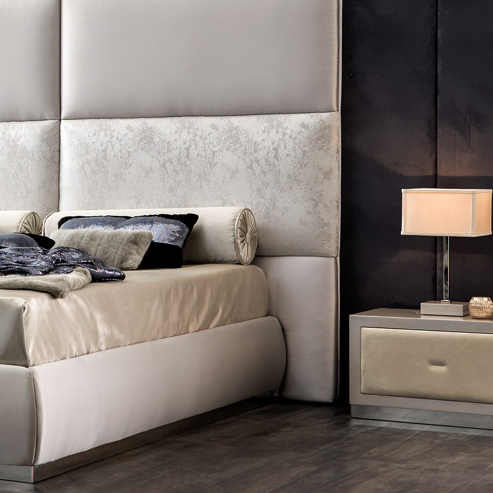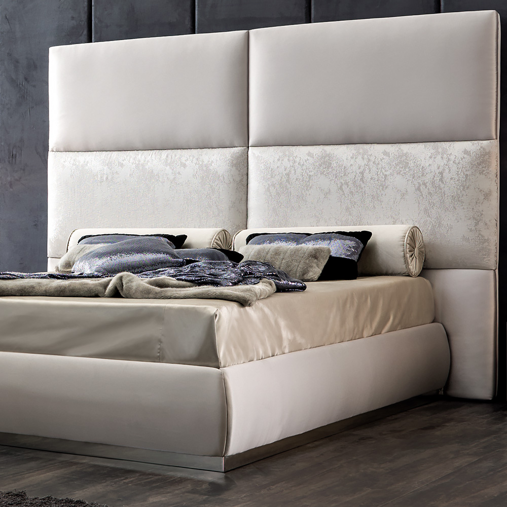 Panel Upholstered Bed With Tall Headboard. This seductive bed uses gorgeous combinations of finishes and textures to make a luxurious statement. This glamorous design features a fabulous tall statement padded upholstered headboard in two textured oyster fabrics. The same sumptuous fabric is used to upholster the main bed base. Finished and complemented in contrast by a beautiful vibrant nickel plinth. Of superb quality this bed offers the ultimate in supreme comfort and style. The headboard is available finished in a variety of fabrics, including customers own. Prices vary. Overall height is 167 cm. Dimensions to fit the standard 180 cm x 200 cm mattress, bed width 230 cm x length 222 cm. Overall width an additional 50 cm to mattress size and overall length an additional 22 cm to mattress size. Special sizes available on request. Sheet, duvet cover, 2 pillow cases, 2 pillows with sequins, 2 pillows, fur throw and bolster cushions as shown available separately. Luxury mattress to fit these dimensions sold separately by Hypnos available with free delivery if ordered with your bed. This bed is part of a bedroom set, also pictured and available. Made to a world class standard. Please allow 9 weeks for dispatch. Made in Italy with a unique attention to detail, creating a contemporary atmosphere for your home.