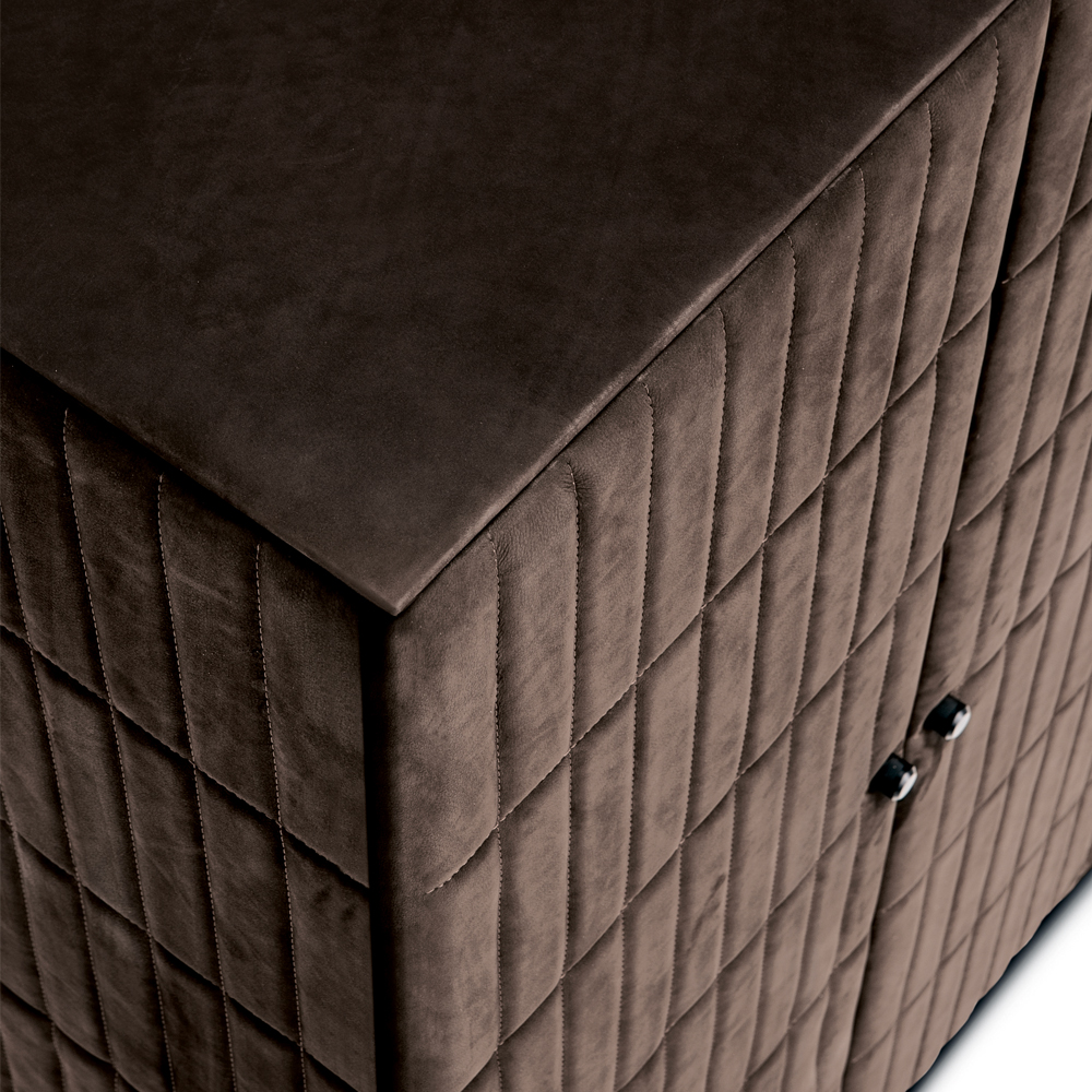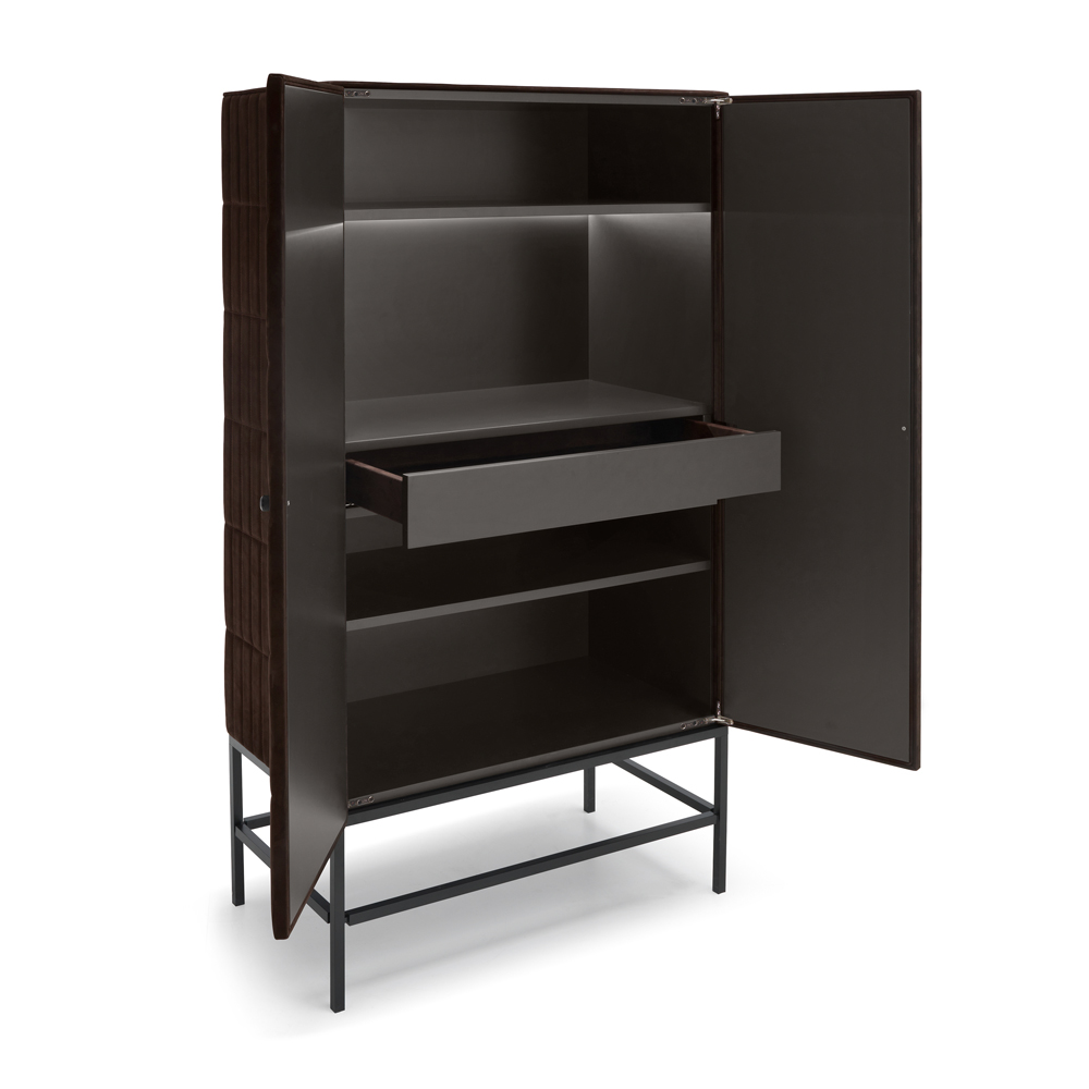 A wooden structure with a quilted stitch detailed chocolate nubuck upholstered finish, housing a matt smoke-lacquered interior with wooden and LED lit shelves. Upholstered internal drawer fitted with a blue motion soft push opening mechanisms to enhance the fabulous minimal look and feel. Modern minimalist steel base and handles in a matt black finish complete this fabulous design. Use in any setting for a functional chic accent. Weight 114 kg. Available in alternative finishes, and in various sizes by request. Prices will vary.