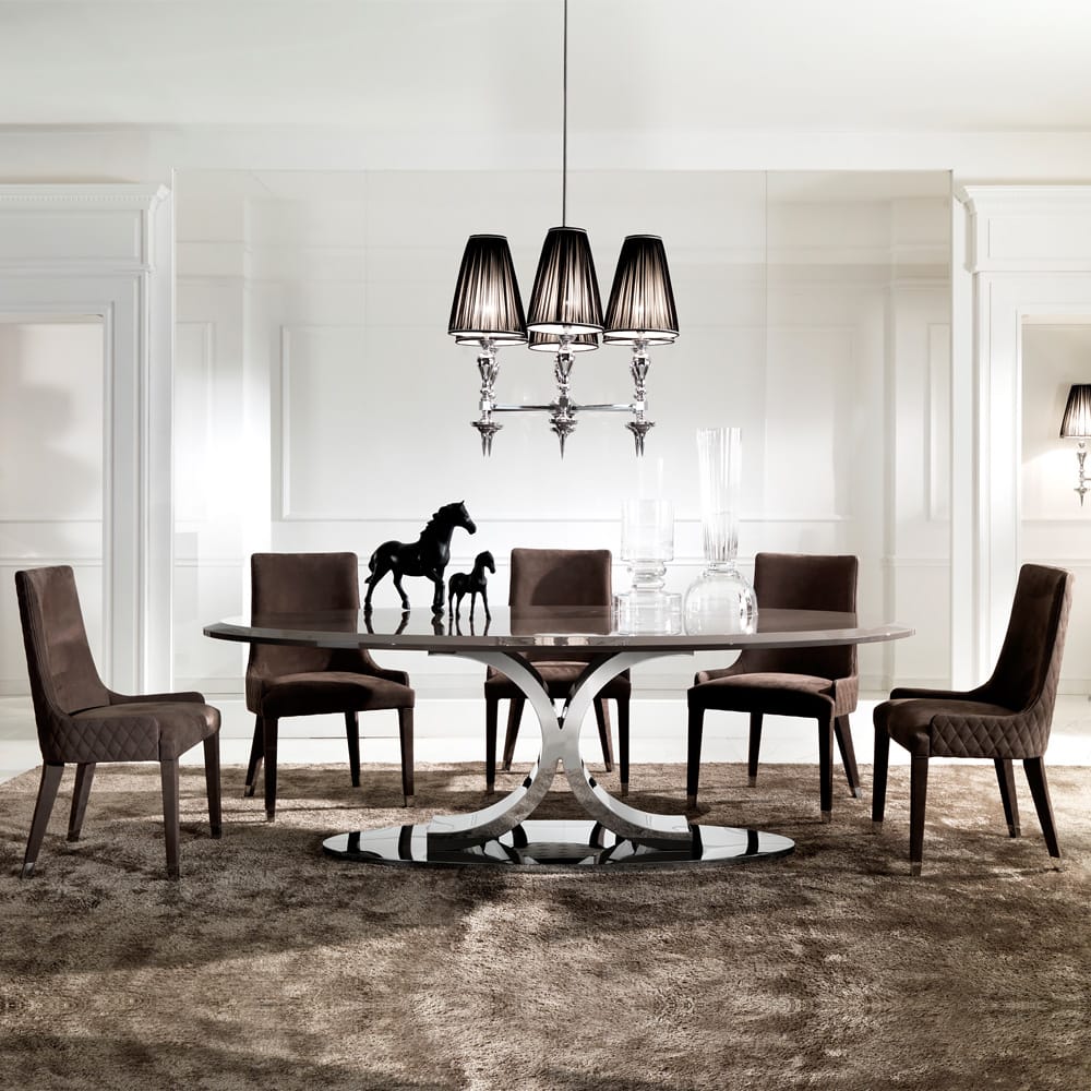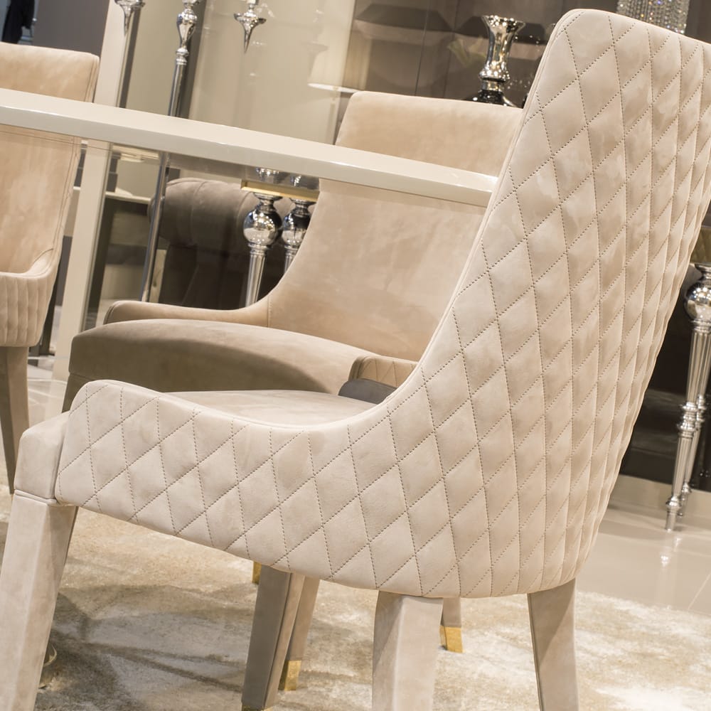A solid beech wooden chair padded and upholstered to the highest standard in a premium Italian nubuck leather with feature diamond quilted back detailing. The legs are also covered in the same matching leather, completed with bright chrome glides. Creating a dramatic effect.
