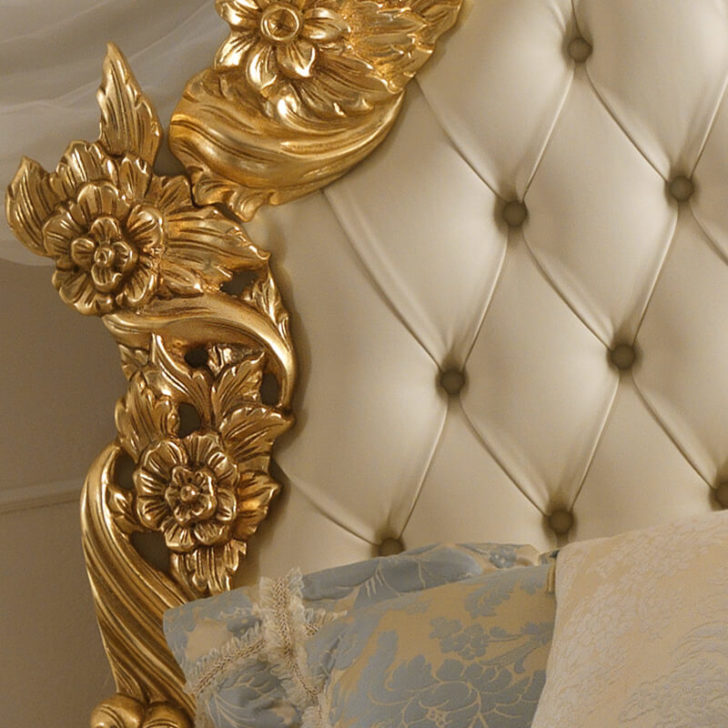 The magnificent Reproduction Italian Gold Leaf Bed is shown here in a fresh gold leaf painted finish. The striking finish of the elaborate carved details is complemented perfectly with the softness of the high quality ivory Italian faux leather button upholstery. Paired here with the Italian Gold Leaf Canopy Crown with rose hanging hooks in a matching gold leaf finish and soft white sheer drapes, creating a truly magical atmosphere. A touch of grace and style for any bedroom, adding the utmost in glamour and extravagance to any setting.