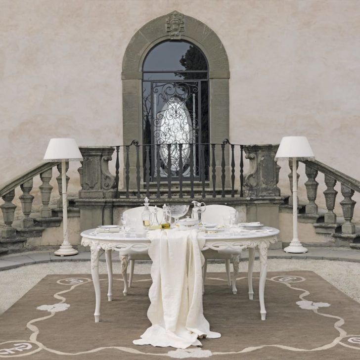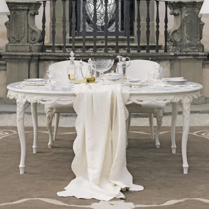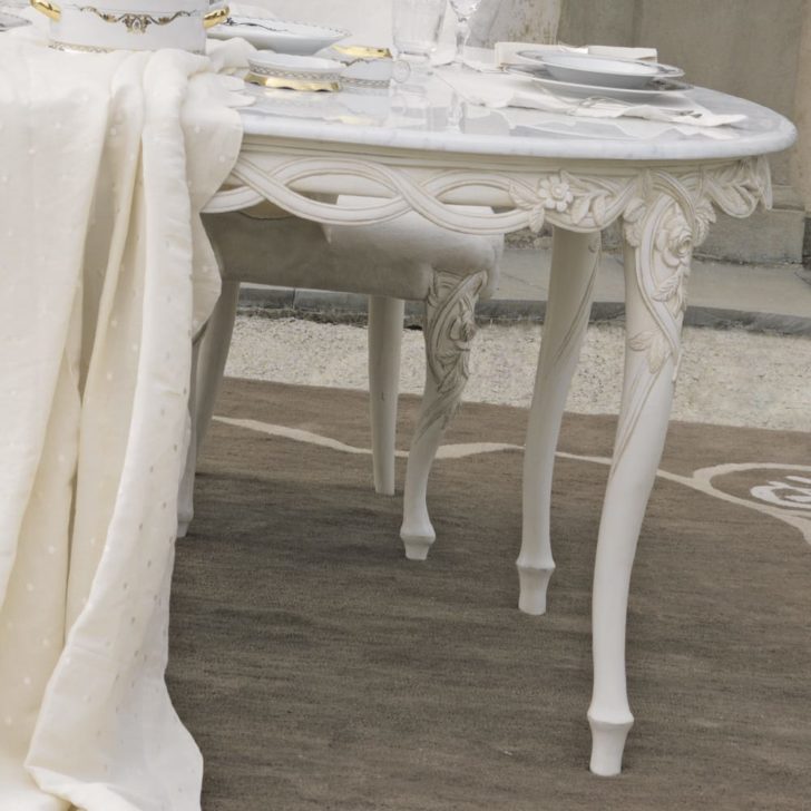 The Reproduction Italian Marble Oval Dining Table with beautiful rose and ribbon detail is shown here in a fresh antique white finish and a luxurious white palissandro marble top. Also available to order in different colours and finishes or a wooden top. Table height 80 cm x width 193 cm x depth 124 cm to seat 6 people, also available in length 265 cm to seat 8 people. Dining chair as shown, in an antique white and bleached gold finish and upholstered in a rich antique white velvet. Other finishes are available. Chair, height 95 cm x width 54 cm x depth 70 cm.