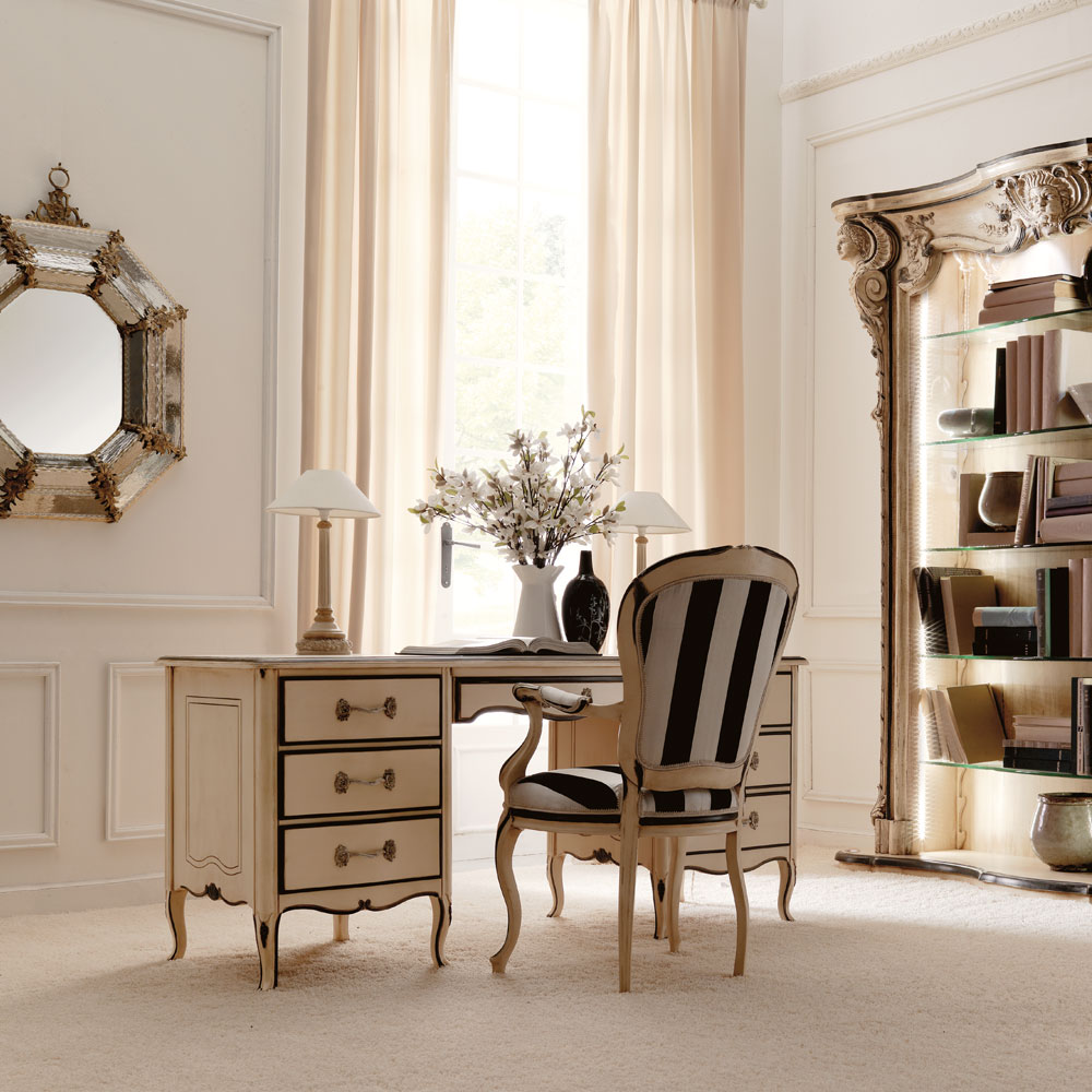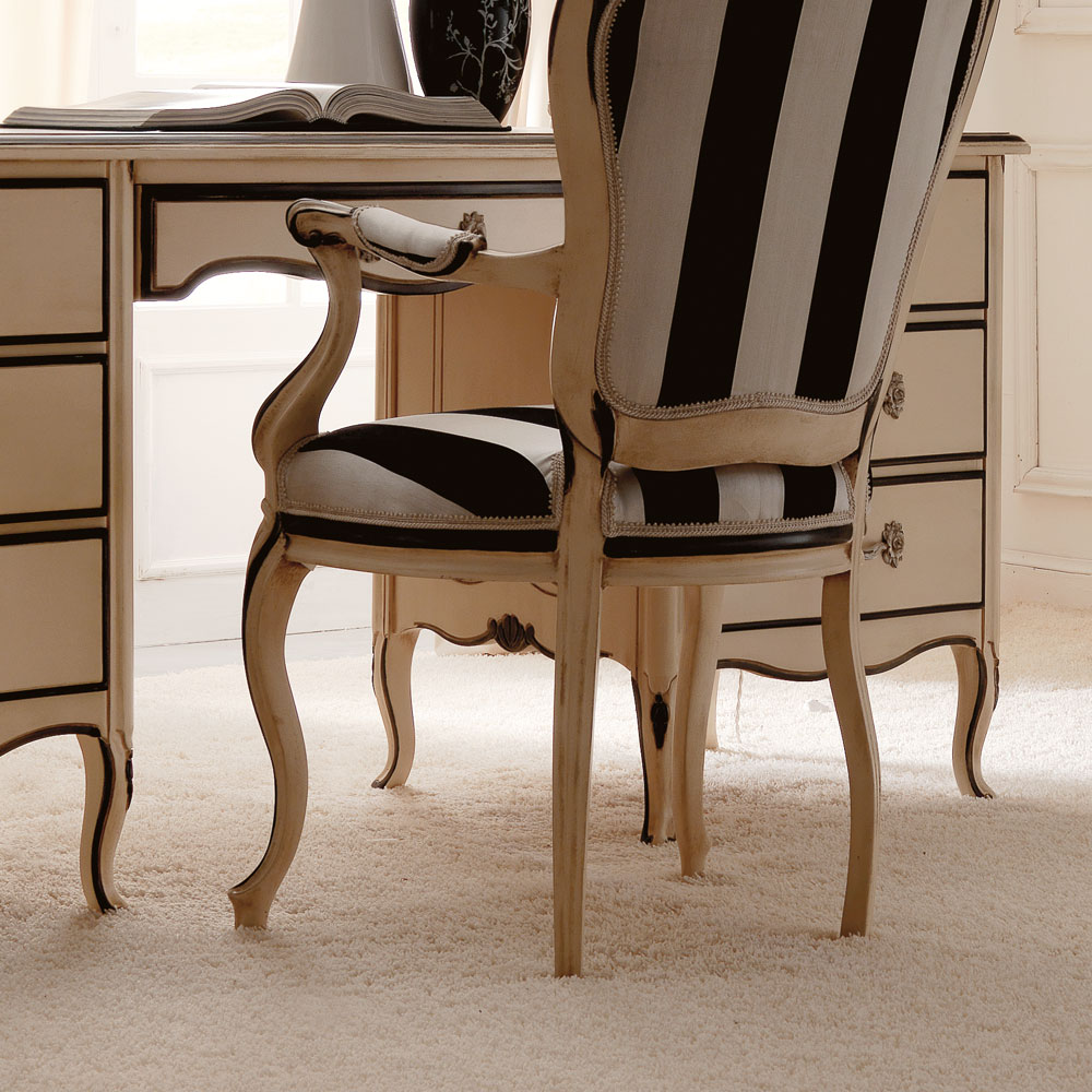 The Reproduction Ivory And Black Italian Desk, shown here in a two tone Ivory and Black finish with Polished brass rose handles. Also available to order in different finishes and a marble top. Height 80 cm x width 177 cm x depth 64 cm. Shown here with the Elegant Italian Designer chair in the same frame finish with a statement striped fabric upholstery to the seat and back. Height 107 cm x width 55 cm x depth 66 cm. Also available to order in alternative fabrics, customers own fabric and finishes. Prices will vary.