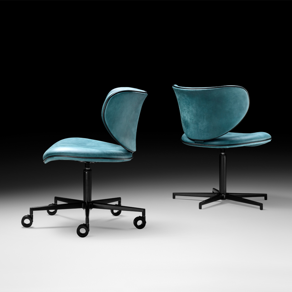 A solid beech wood curved structure, foam padded in various different densities for the ultimate in luxurious comfort. Shown here upholstered to the highest standard in a rich nubuck leather, further enhanced by stunning black faux leather piping detail which outlines the elegant profile. On stylish die-cast aluminium 5 point star 360° swivel legs – with, or without wheels – in a matt black painted finish, adding a contemporary twist. Available in 2 styles as shown. Office Chair, height 80 cm x width 63cm x depth 68 cm, seat depth 45 cm and seat height 47 cm. And Office Chair with wheels, height 80 cm x width 63cm x depth 68 cm, seat depth 45 cm and seat height 47 cm. Covers are not removable. Alternative base finishes, leathers and fabrics including customers own in various combinations and customised sizes by request. Prices will vary.