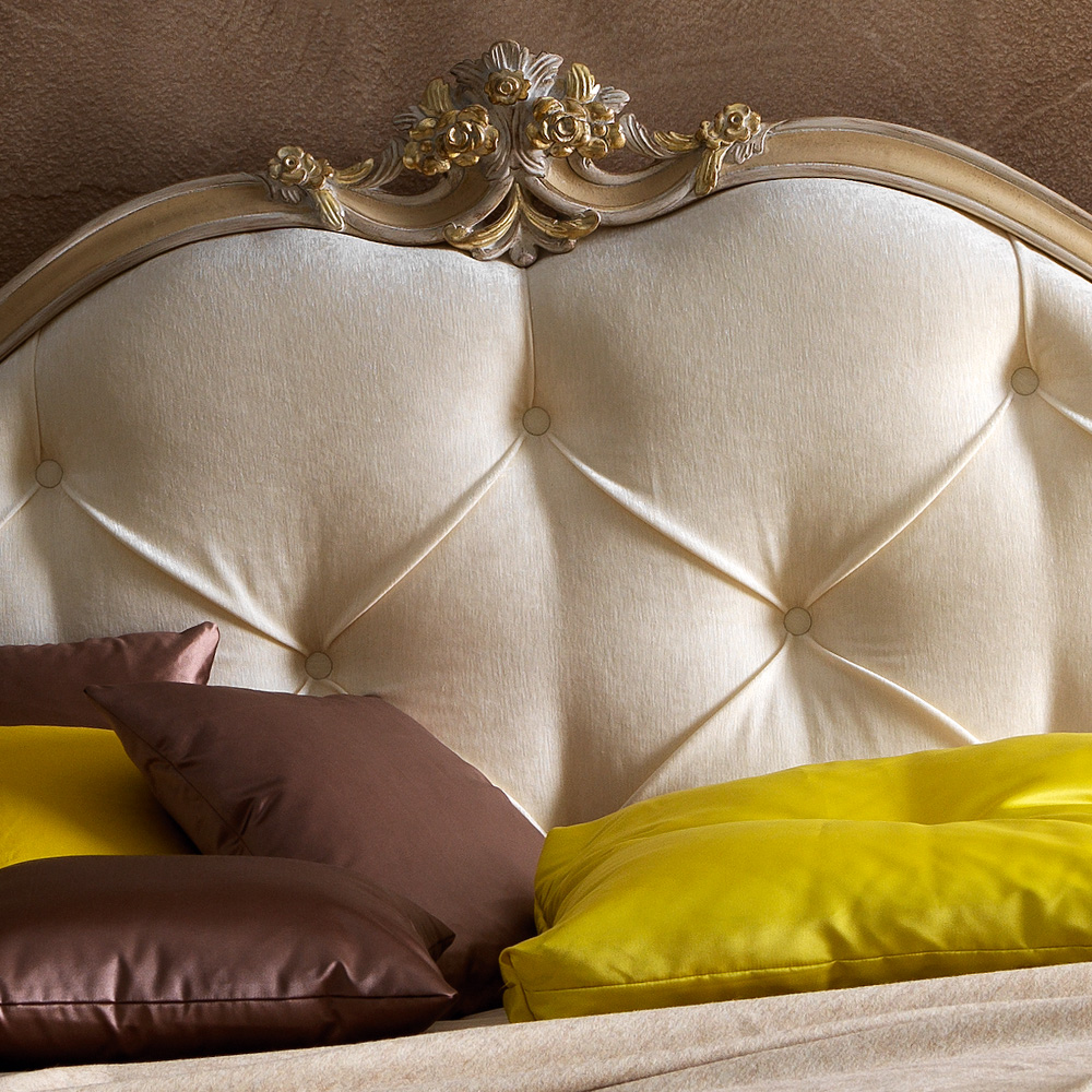 A wooden structure shown here in an Antique White finish, together with beautiful antiqued hand painted accents of sand tones and Gold to the intricate carved detailing and feminine curves of the classic headboard and detailed base. Padded in various densities and completed with the finest button upholstery to the headboard in a fresh ivory velvet of the highest quality. Height 147 cm x width 209 cm x length 209 cm, for mattress size width 170 cm x length 200 cm. Slats are included. Alternative frame colours, finishes, fabrics as well as customers own and special sizes also available by request. Prices will vary.