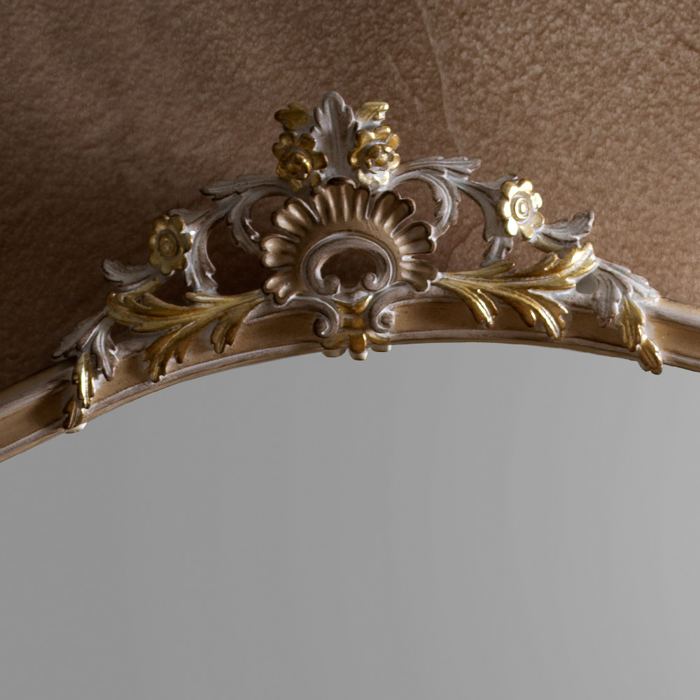 Designed in a classic style making its intricate carvings its defining aspect. A beautiful curved mirror encased in a wooden frame structure, shown here in an Antique White finish, together with beautiful hand painted accents in Sand Tones and Gold accentuating the intricate carved detailing. Height 93 cm x width 106 cm. Alternative finishes and special sizes also available by request. Prices will vary.