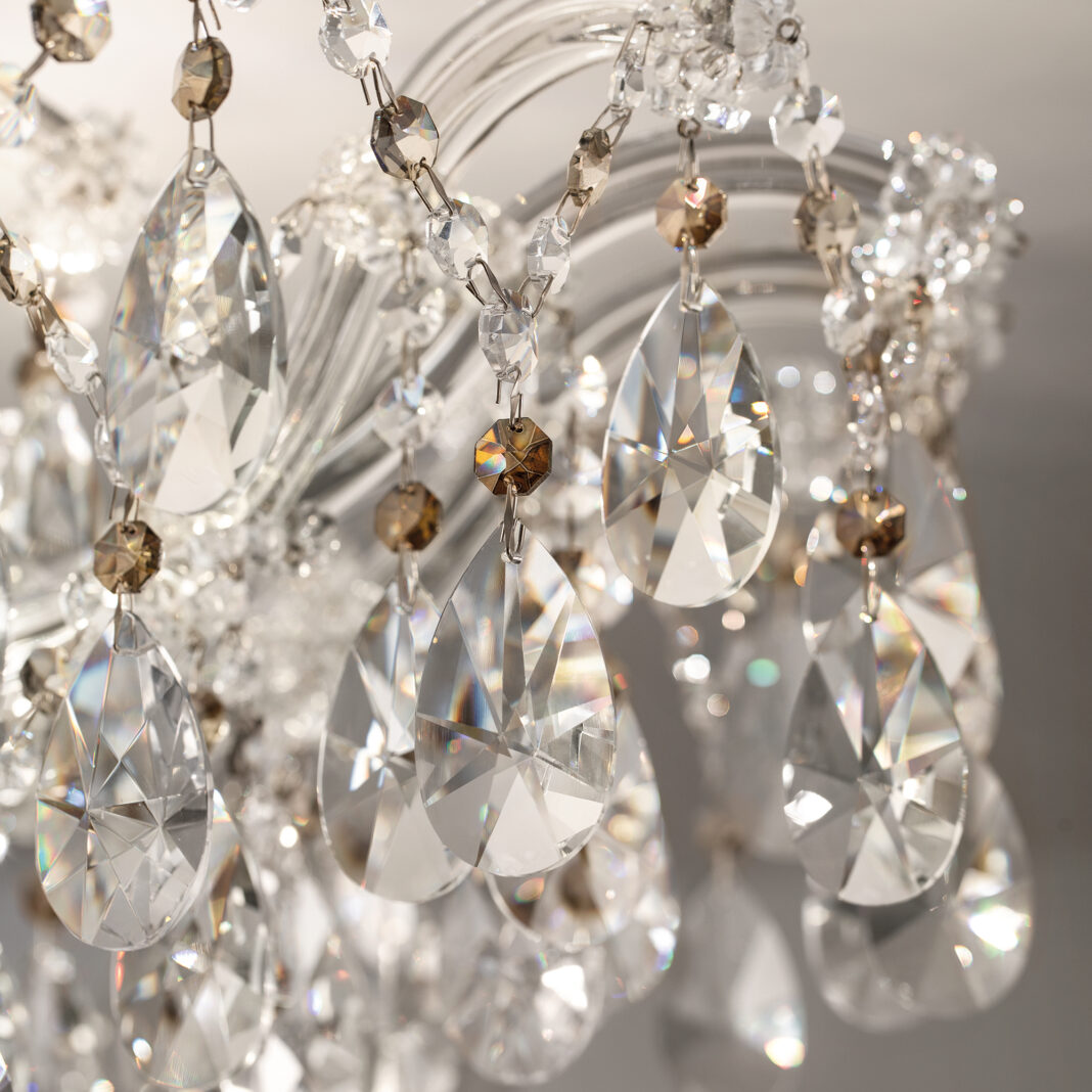 Elevating any space with sophistication. Its galvanised metal frame in a polished chrome finish with arms covered in clear glass, is adorned with dazzling crystals. Transparent with a dash of smoked, in either half cut glass, cut crystal or premium crystal. Radiating a warm and inviting glow.
