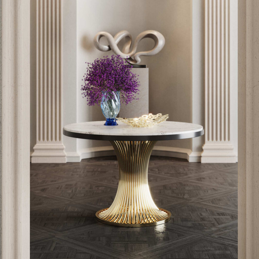 The Round Marble Contemporary Dining Table is simply exquisite. An expressive piece that makes a stunning statement for any living space. Impeccably executed by master craftsmen. Its combination of bold lines, curves and timeless materials adds a touch of sophistication to both classic and contemporary interiors. This elegant design would serve as a glamorous dining table, or welcome in a hallway as shown. Offering a sophisticated ambience. For social gatherings, or professional meetings⦠its versatility is boundless.