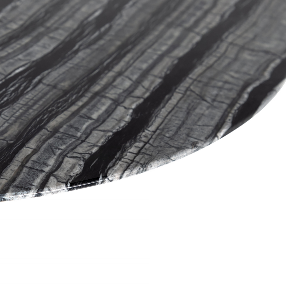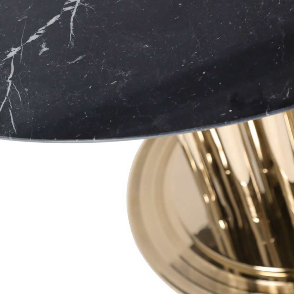 The perfect union of materials, a harmony of forms. A brass structure in a fabulous polished 24 carat gold finish, completed by a round Kenya Black Marble marble top with defined veins of white. Creating a truly fabulous focus. Various other finishes such as a matt, polished and brushed gold, brass, nickel, black nickel and copper and matt or high gloss RAL lacquer colours and marbles such as Estremoz and Dark Emperador are also available by request. Prices will vary. Also available with a matching marble Lazy Susan.