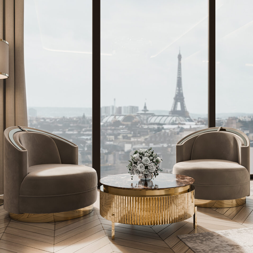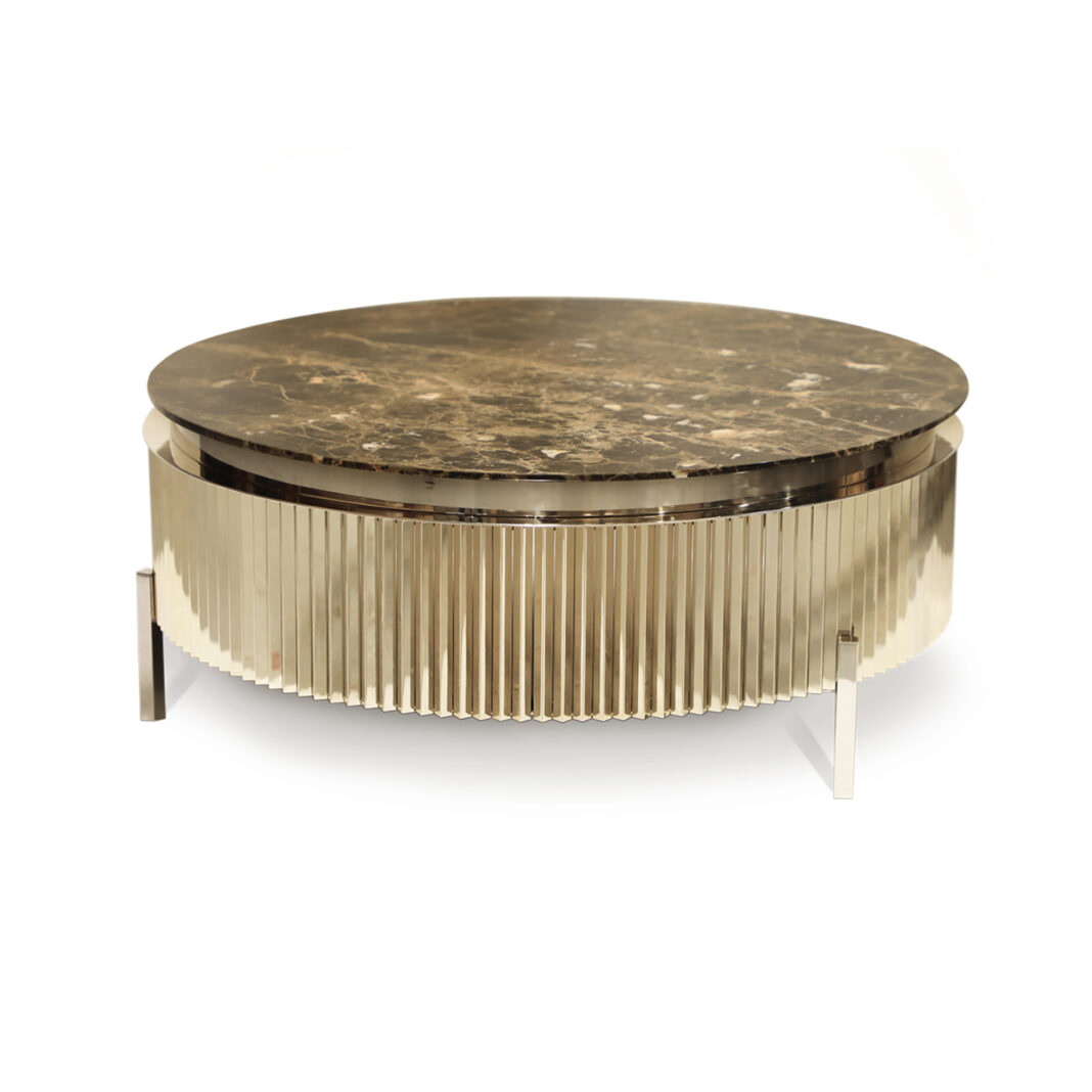 Superbly executed by master craftsmen and outstanding in their use of luxury materials and attention to detail. A remarkable ribbed brass structure with distinctive Art Deco styling in a fabulous polished 24 carat gold finish, completed by a beautiful round Emperador marble top. Creating a truly fabulous focus. Various other marble and finishes such as a matt, polished and brushed gold, brass, black nickel and copper and matt or high gloss RAL lacquer colours are also available by request. Prices will vary.