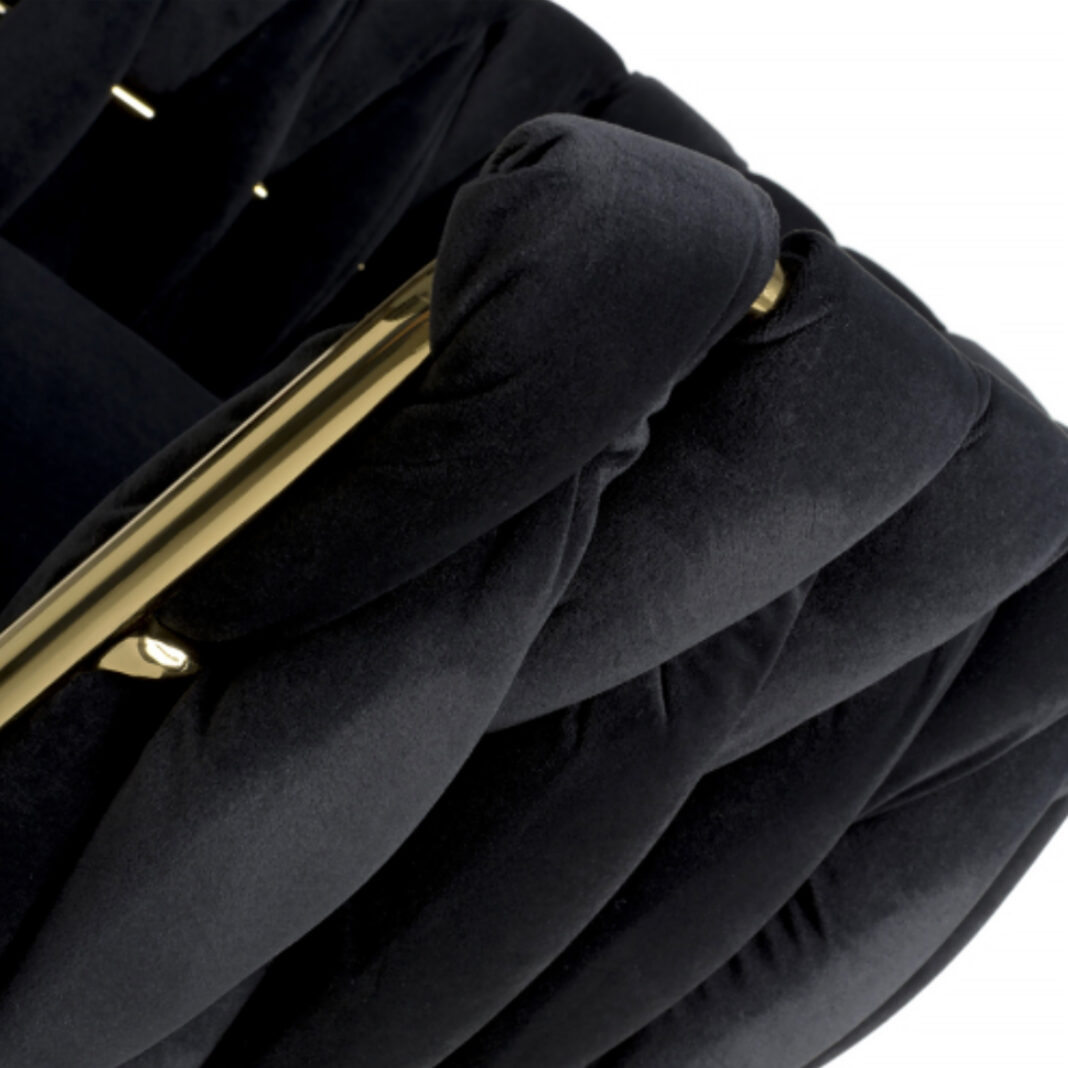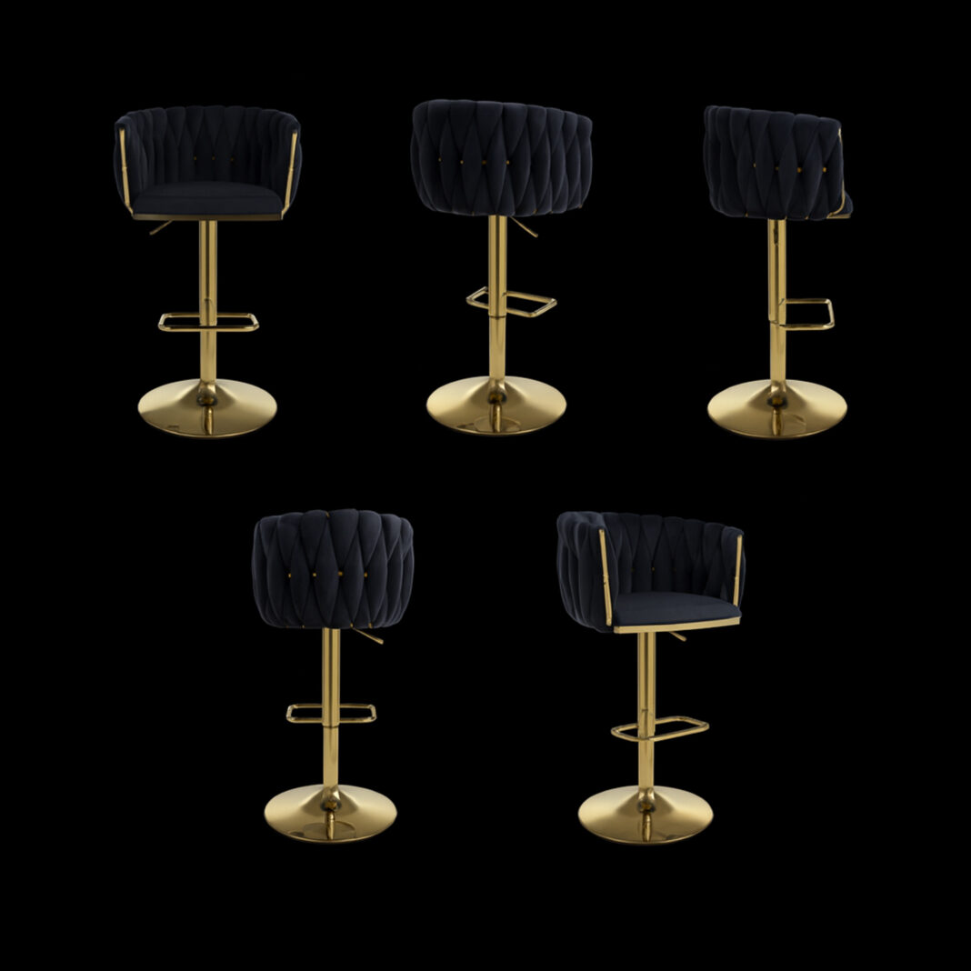 Beautifully woven bar stools perched on striking gold bases, featuring smooth black brushed velvet upholstery intricately threaded around semi-circular gold backrests for a look of refined elegance. Plush padded seats and high, supportive armrests ensure comfort, while gas lift adjusts the heights from 85 cm to 107 cm via under-seat handles. The seats also swivels a full 360 degrees for effortless versatility.