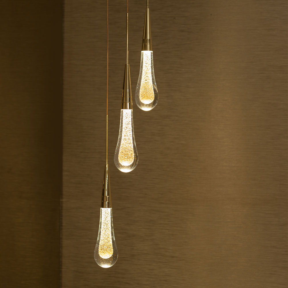 The Set of 3 Glass Drop Pendant Lights, stimulate the senses and create a seductive atmosphere with this wonderful sculptural light. An elegant modern focus, ambient lighting at its best. Reverberating light, creating a display of brilliance and shadows. A sumptuous touch for a stairwell or boudoir! Can be purchased as individual or additional pieces for larger and smaller areas.