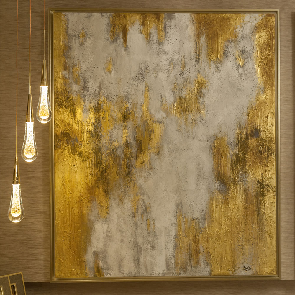 Beautifully realised, circular ceiling roses and elements in a gold finish supporting bubbled gold glass pendant drops creating the illusion of morning dew. Offering a fascinating focus. Measurements as shown for all 3 lights together height 130 cm x diameter 22 cm. The ceiling roses measure diameter 7.8 cm, with feature copper coloured cables.