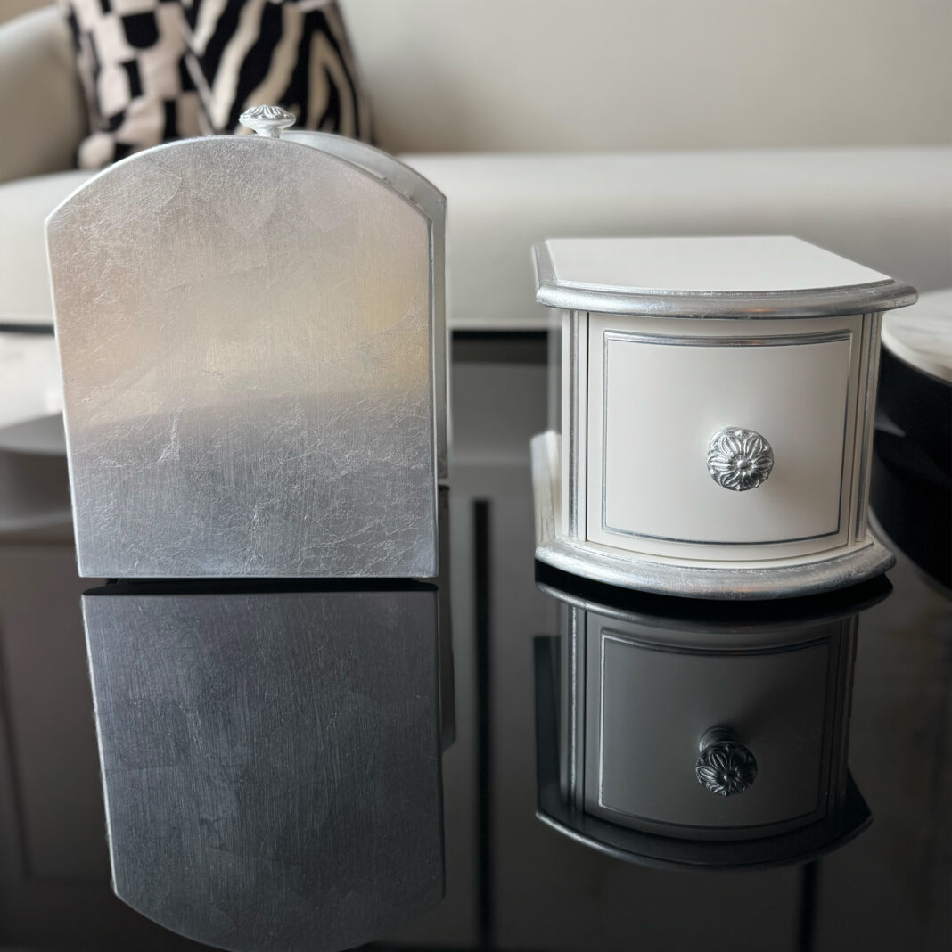 Defined by its intricate carvings, the piece is further accentuated by an exquisitely detailed wooden handle. A white lacquered finish, paired with beautiful antiqued silver leaf accents, brings the design to life. The interior is also finished in a white lacquer and has internal dimensions of height 11 cm x width 13.8 cm x depth 22.2 cm. And the drawer has integrated soft close runners by BLUM for effortless closing and added luxury. Alternative sizes and finishes are also available. Prices will vary.