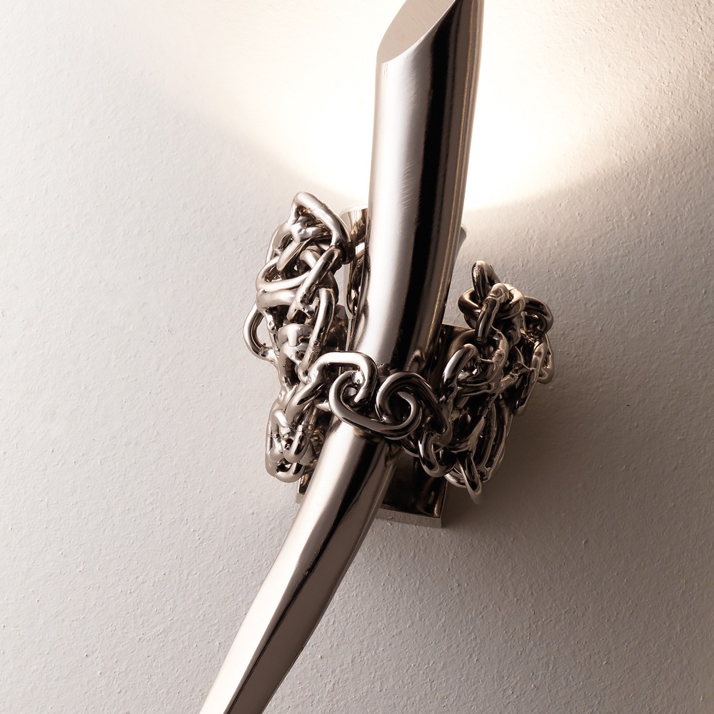 This design is certainly no exception and features a brushed chromed brass structure, comprising of a loosely chained horn, creating a dramatic seductive atmosphere and a unique visual effect.