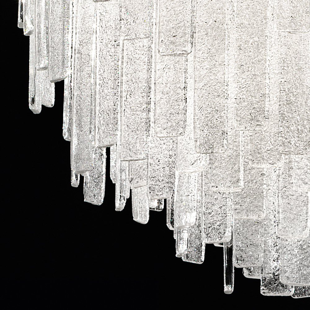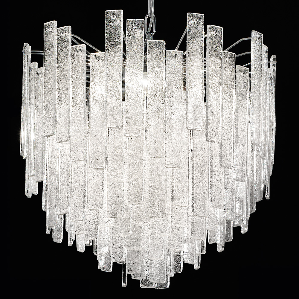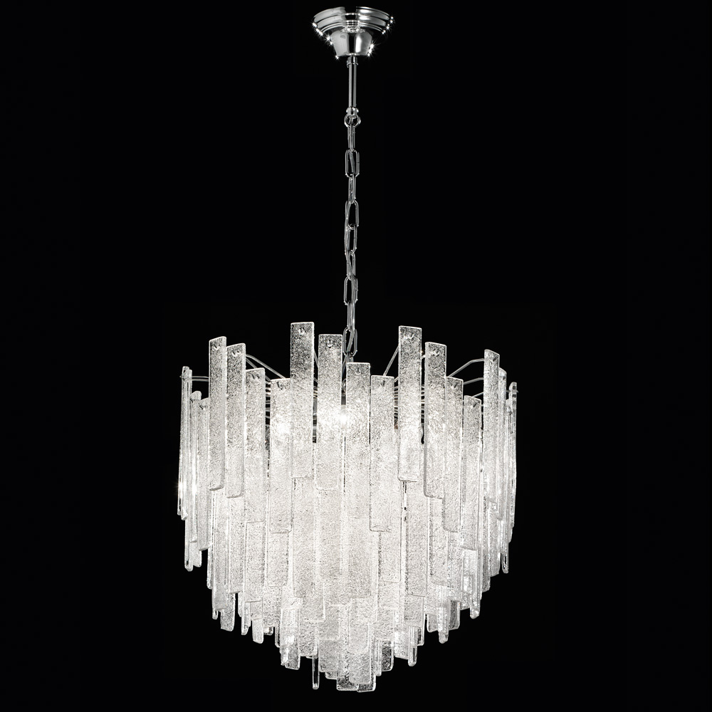 Supported by a chrome ceiling rose, a painted metal frame supports elegant strips of hand made cast glass in a graniglia or grit finish. A process where a fine grit is mixed with the glass while it is still molten to create a finely-textured surface. Weight 29 kg. Hanging chain is 100 cm as standard, and can be altered at installation stage. Requires 6 x E27 20 W max bulbs, not included. Part of a fabulous collection, wall light and larger chandeliers available.