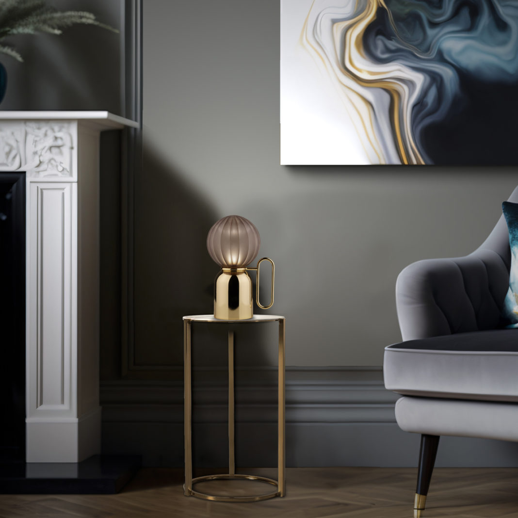 Metal, aluminum and brass components are combined to create the structure. Finished in a Shiny gold and adorned with a Satin tobacco Borosilicate glass shade with twisted stripes. Creating a striking feature against the gold. Available as a battery charged lamp with led and rechargeable battery system – which requires 1 COB LED 2W – 4000°K – 2,7 Vdc – 440 Lma, or as a lamp with a cable – which requires 1 x G9 bulb max 6W – 220 Vdc. Both styles are dimmable, ignition and dimming with touch button. Part of a fabulous collection and available in a Shiny crome, Satin gold, Black nickel, Antique copper, Matt black RAL or RAL 2010 orange finish, and in Transparent, Satin transparent, Satin fumè, Satin aquamarine and Satin viridian colour by request. Prices will vary.