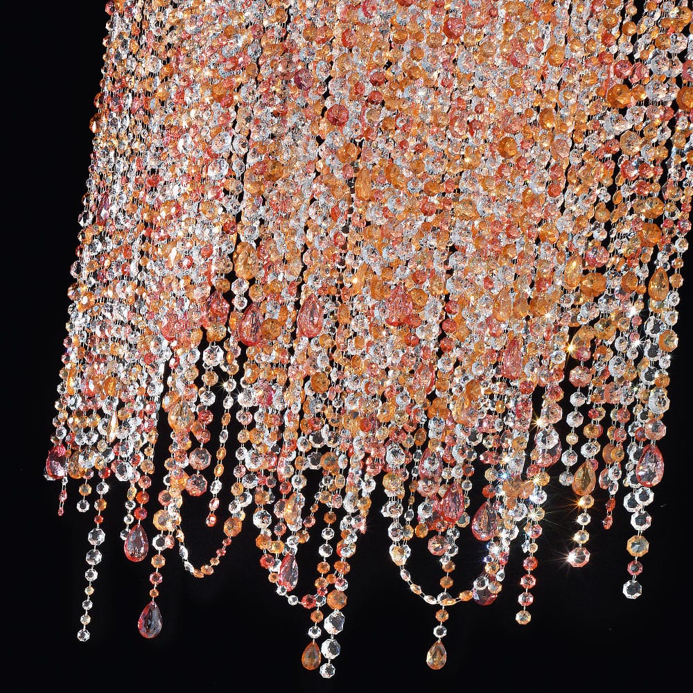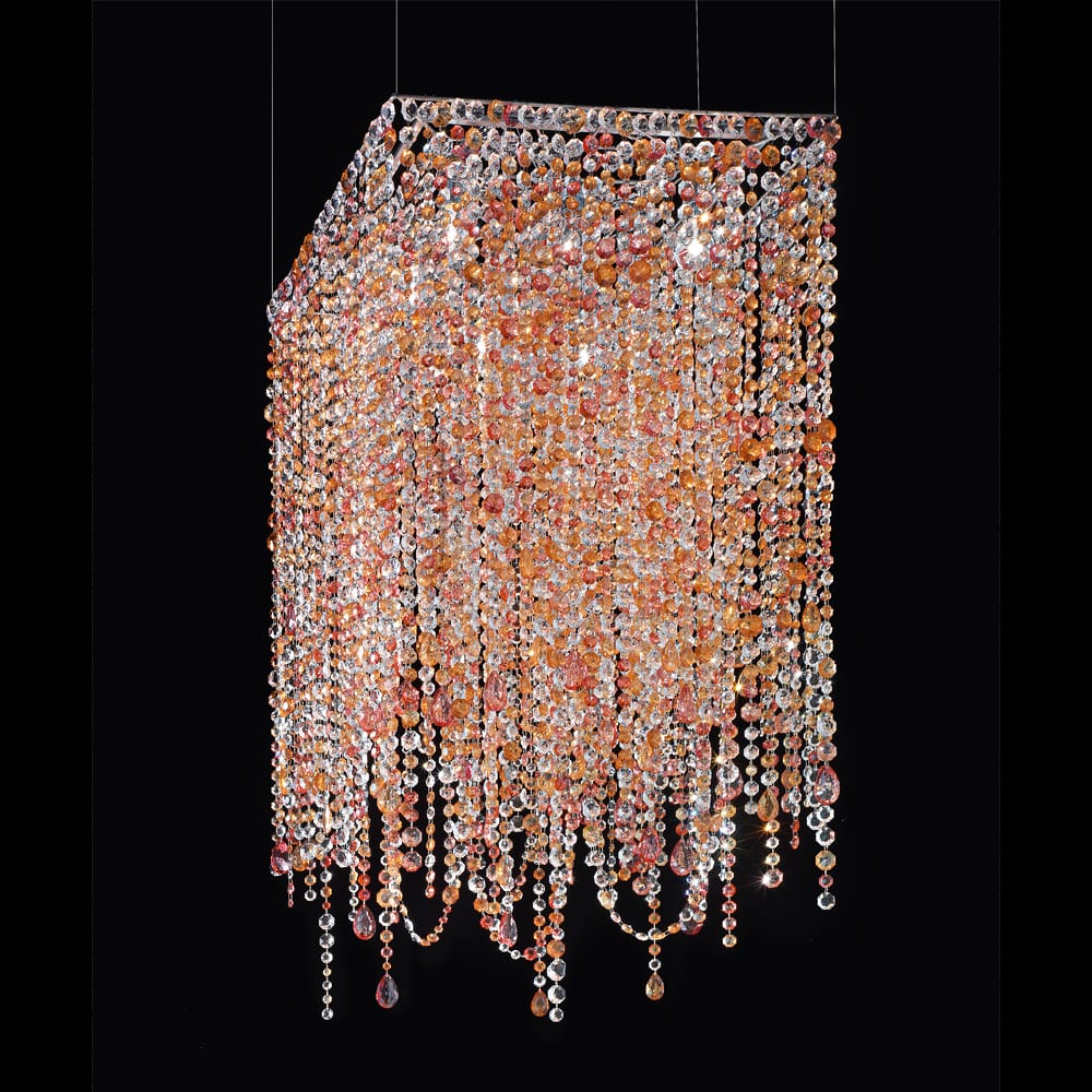 This glamorous chandelier or ceiling light boasts a beautifully crafted square structure and is decorated with strands of multi coloured crystals for a truly opulent effect. Height 140 cm x width 70 cm x depth 70 cm. Weight 25 kg. Uses 8 x E27 60 watt max bulbs, not included. Alternative glass bead colour options are available, and also an alternative chandelier in the same style but with transparent half cut glass pendants is also available by request. Prices will vary.