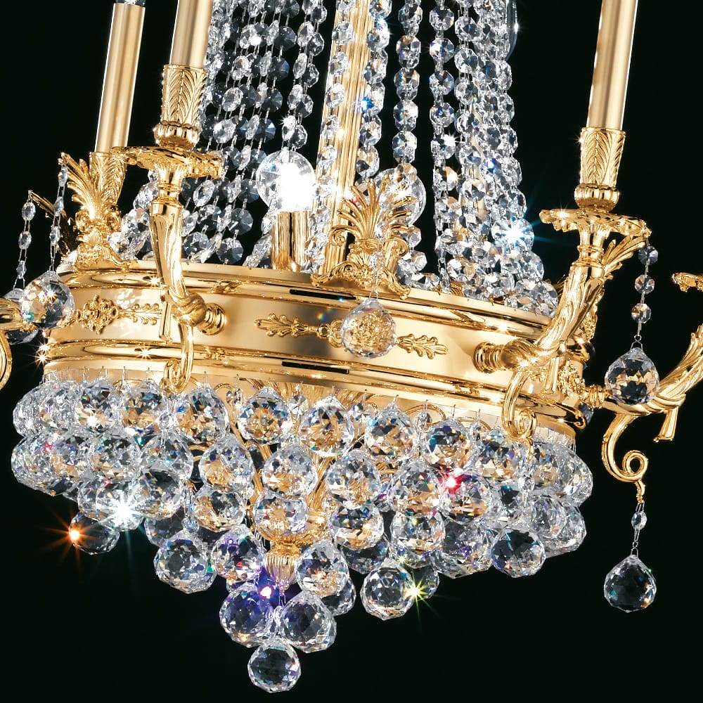 Statement Empire Style Crystal Chandelier with a stunning spherical drop pendant arrangement to the base. Featuring further crystal chains together with and elegant slim candle style lights. Made from an ornate solid brass gold plated frame adorned with genuine cut crystal or premium crystal. Luxurious silk or organza shades available separately if required.