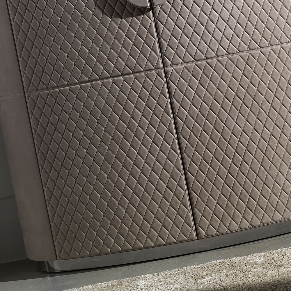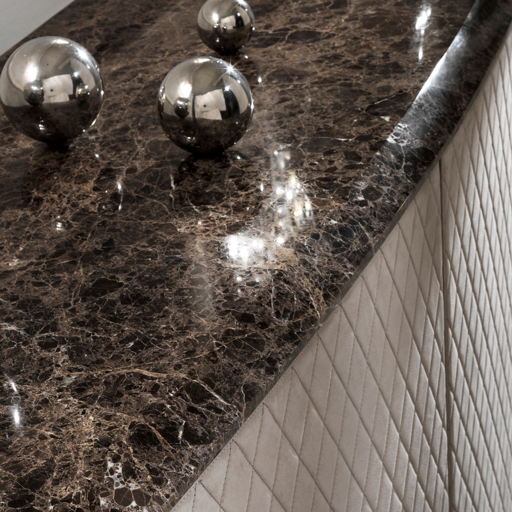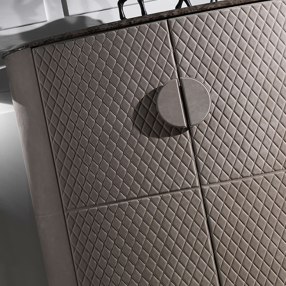 Shown here in a luxurious high quality nubuck leather finish as well as matching handles and the doors in a matching padded quilted finish with exquisite stitching detailing. All nestled on a polished steel plinth base with the finest curved and bevelled marble top in beautiful brown tones.
