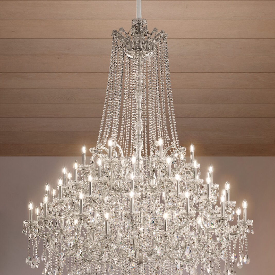 Its galvanised tiered metal frame in a polished chrome finish with arms covered in clear glass, is adorned with dazzling crystals and bobèche. Transparent with a dash of smoked, in either half cut glass, cut crystal or premium crystal. Radiating a warm and inviting glow. Weight 103 kg. Requires 56 x E14 10 W MAX bulbs.