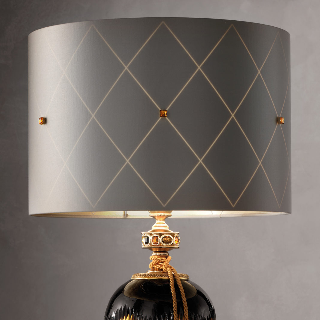 A beautifully detailed ornate brass structure in a satin gold finish, supporting a classic shaped body of amber and blue facet cut textured glass hand blown in Tuscany and embellished by hand with stones. Adorned with an exquisite gold rope tassel, and completed by a cylinder shade in a luxurious diamond fabric, tied in with beautiful stone detailing. Weight 5.7 kg – which requires 1 x max 60W E27 Bulb, not included. Available with alternative shades, in various sizes and in a shiny gold or an amber glass finish by request. Prices will vary.