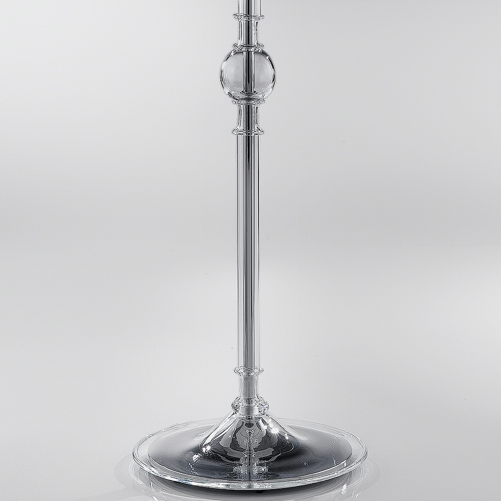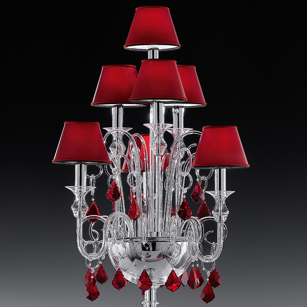 Boasting a sturdy central frame in a chrome finish, this floor lamp features six clear glass arms that curve elegantly upwards surrounding a central arm. Each arm is topped by a red fabric shade. Curled clear glass flourishes extend outwards from the base, with each flourish and arm being complete with a red glass crystal drop descending from a clear glass ring. Requires 7×E14×46-watt clear HSGSB/C/UB halogen bulbs or 7×E14 LED bulbs, not included. Available in alternative sizes and finishes by request. Prices will vary.