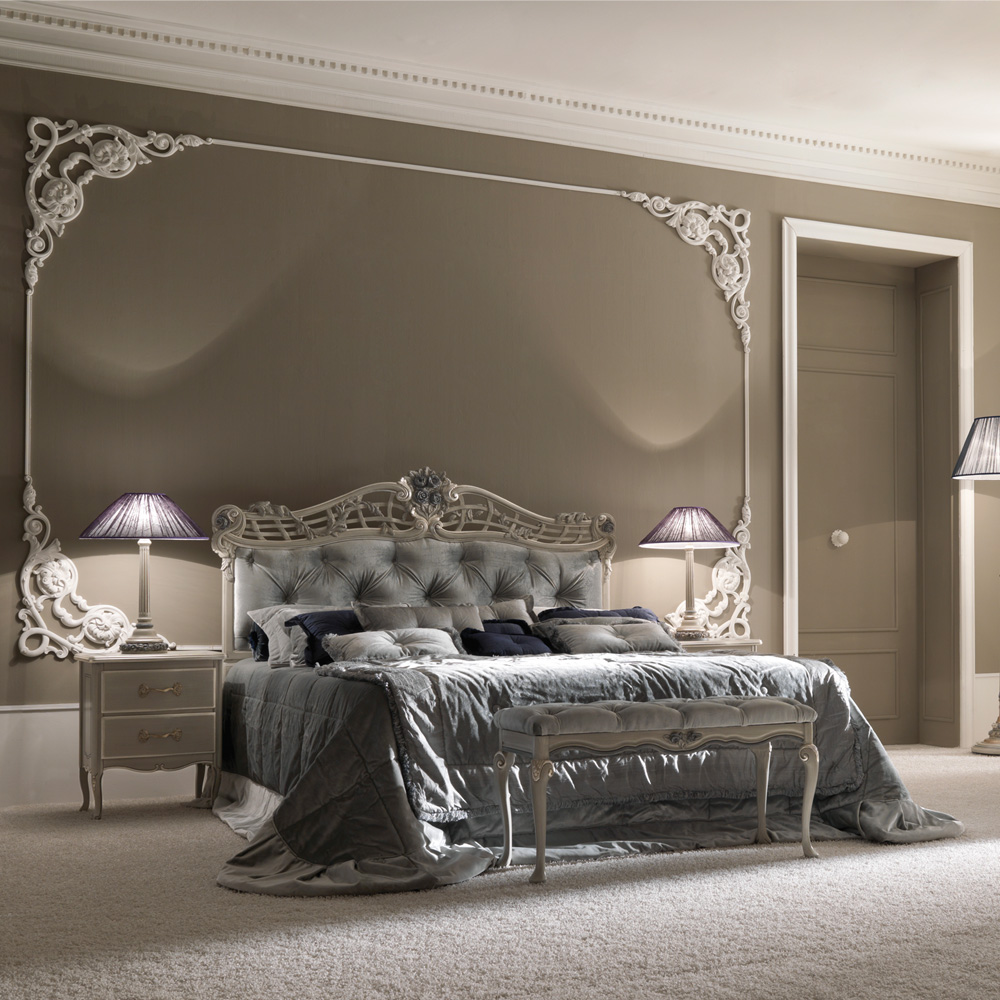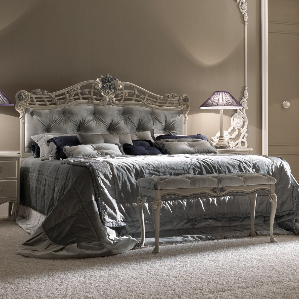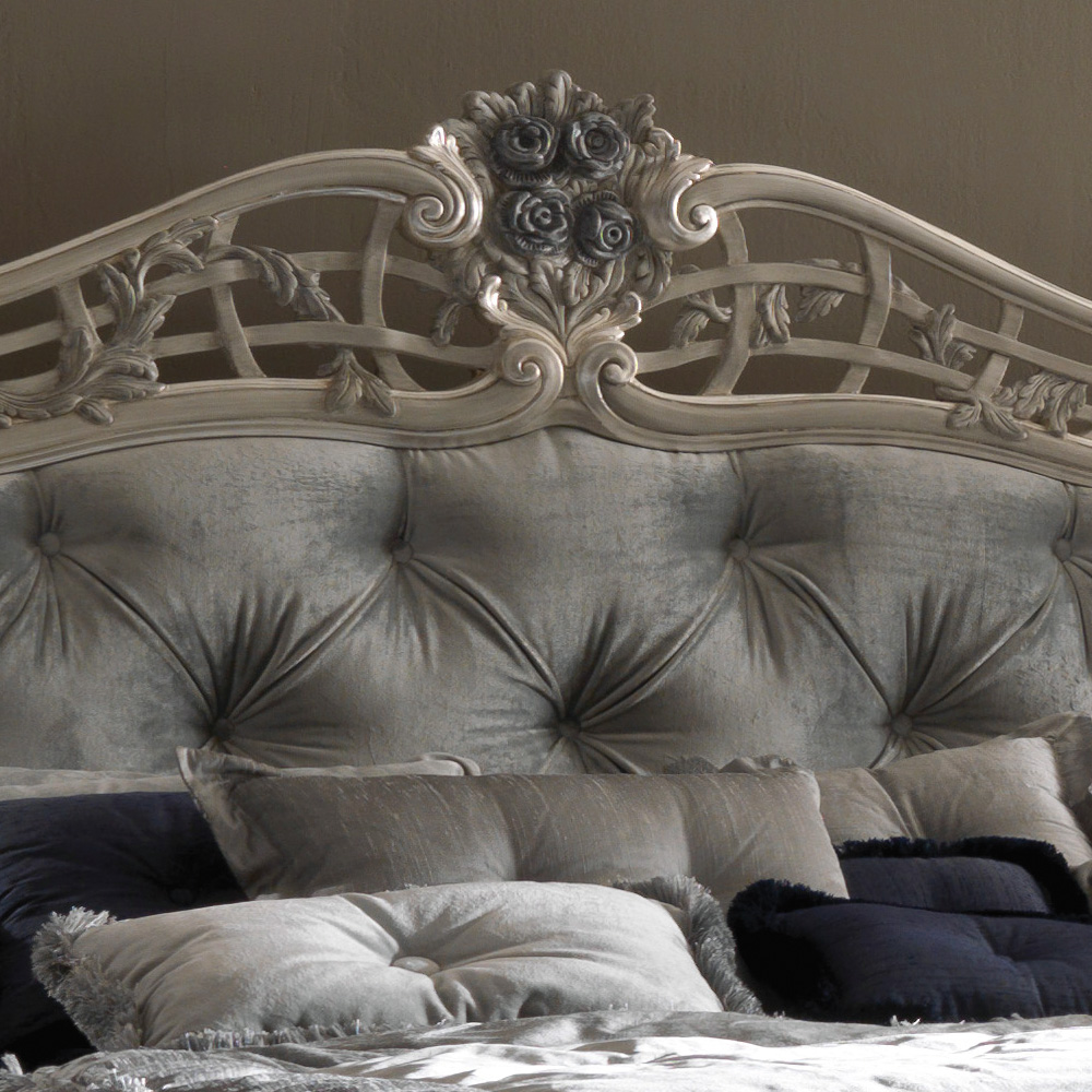 The Trailing Roses Italian Button Upholstered Designer Bed finished by artisans in a luxurious painted silver, grey and blue frame and button upholstered with a high quality luxurious pale grey velvet. In 4 sizes as standard. To fit mattress 170 cm x 200 cm, overall size height 152 cm x width 194 cm x depth 209 cm. To fit mattress 180 cm x 200 cm, overall size height 152 cm x width 194 cm x depth 209 cm. To fit mattress 190 cm x 200 cm, overall size height 152 cm x width 214 cm x depth 209 cm. And to fit mattress 200 cm x 200 cm, overall size height 152 cm x width 214 cm x depth 209 cm. Other sizes are available to order with alternative fabrics and leather, including customers own fabric, frame colours and finishes and also as a headboard only. Prices will vary. Cushions are available by request, but not included in the price.