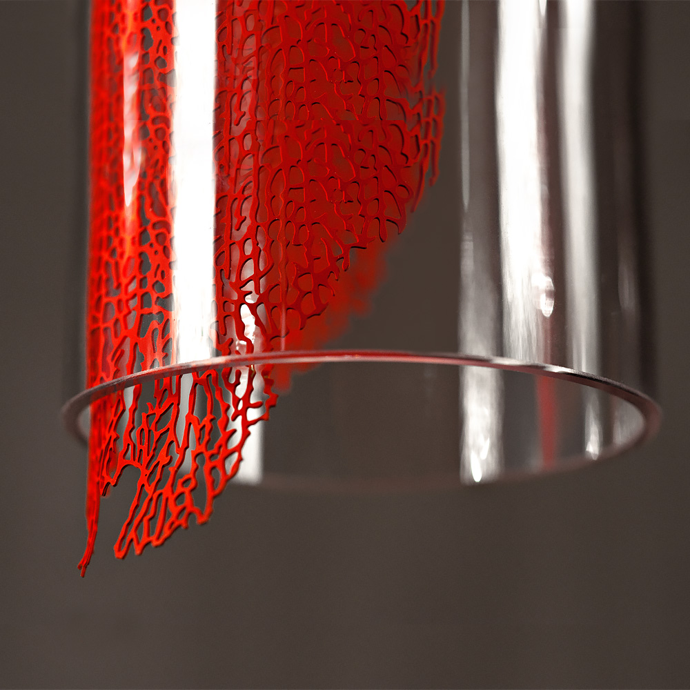 Suspended from a single circular ceiling fixture. The metal imprint is available finished in coral or silver as shown, white or gold, prices vary. Use a mix of colours and sizes as displayed here to add another dimension. A matching wall light also available in the collection completes the contemporary look. Available in two sizes as standard. Height 45 cm x diameter 7 cm x overall suspended height 190 cm. Also height 45 cm x diameter 10 cm x overall suspended height 190 cm.