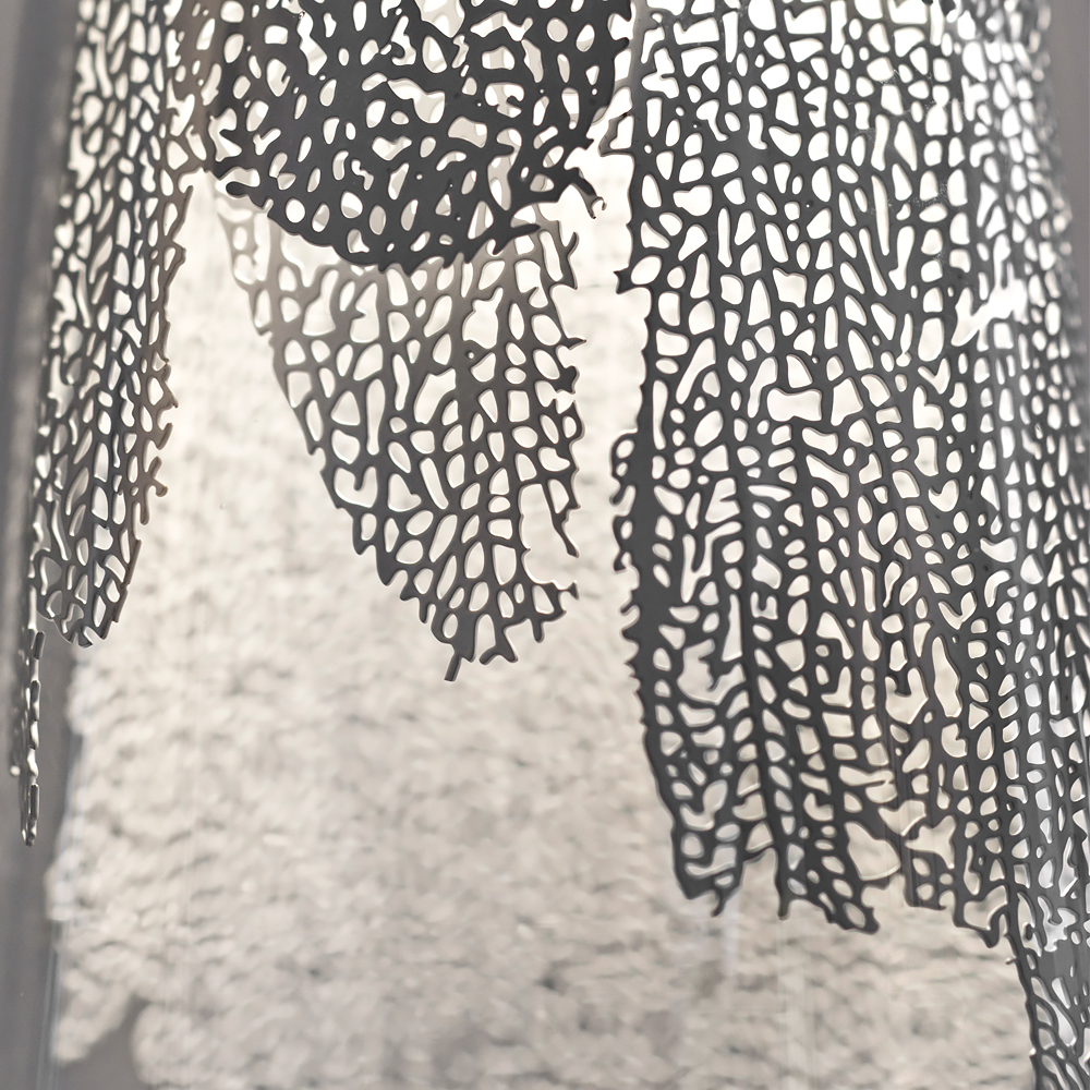 Unique Contemporary Designer Pendant Light. This fabulous eye-catching design is intelligent and subtle. Encased in the highest quality Borosilicate glass is a delicate metal imprint of a coral leaf. Hidden inside is a single bulb projecting a dynamic shadow making this unique design outstanding in its simplicity. Borosilicate glass is known for its exceptional quality and durability taking this light to a different level of superiority.