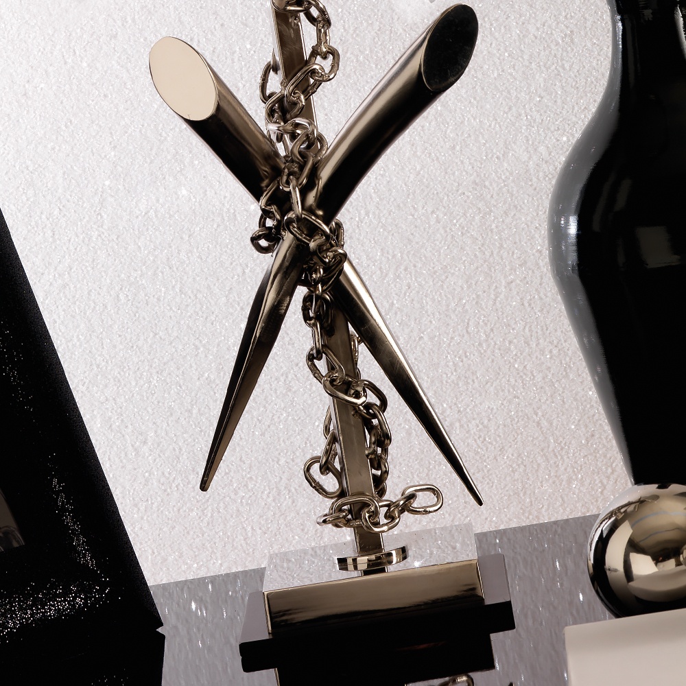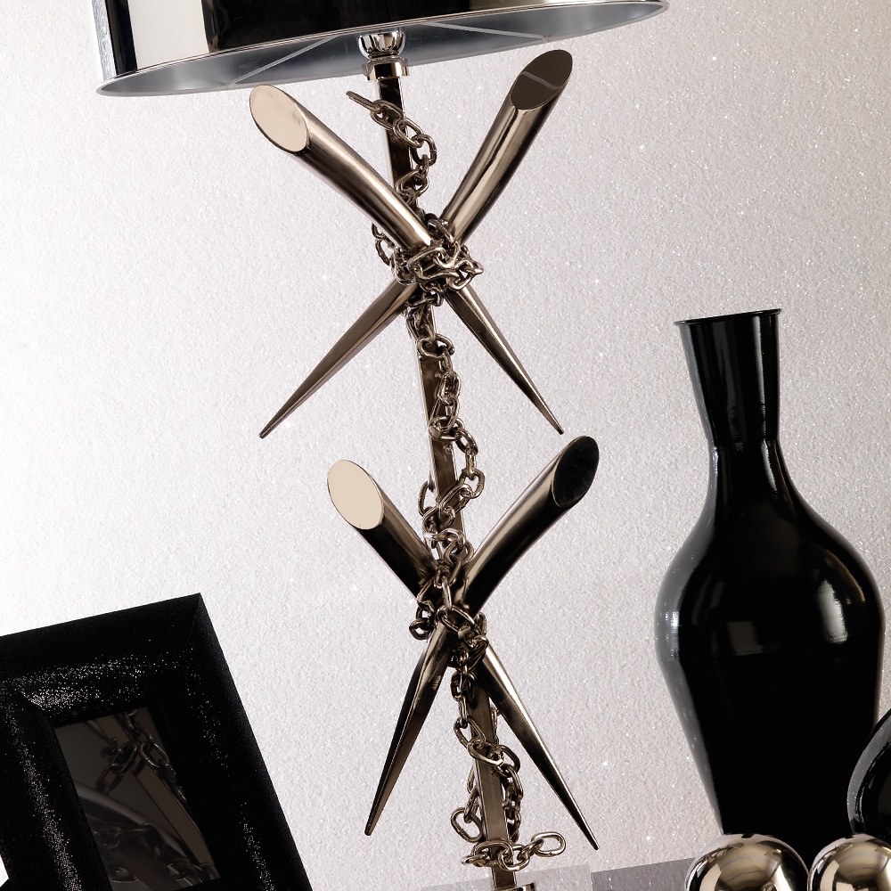 This design is certainly no exception and features a brass structure with a brushed chrome finish. Detailed with a wonderfully daring design featuring crossed horns loosely ‘chained’ to the main stand. Complete with a silver foil luxury lampshade. Altogether creating a dramatic seductive atmosphere and a unique visual effect.