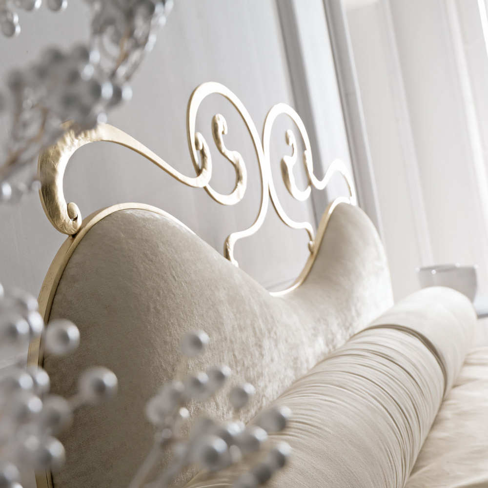 The Upholstered Gold Leaf Swirls Bed, a beautifully romantic bed that epitomises modern Italian furniture. Truly reflecting refined contemporary elegance. Superbly executed by master Italian craftsmen this design is outstanding in its use of luxury materials and attention to detail. Offering accomplished modern furniture with unmistakable style and presence.