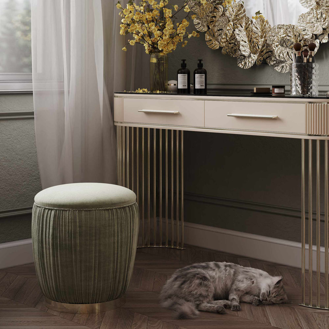 The Velvet Pouffe With Gold Plated Base is simply exquisite. More than meets the eye, with a sophisticated high-end look. Suiting an Art Deco inspired, classic or modern interior for the refined design lover. Superbly executed by master craftsmen, functional yet refined.