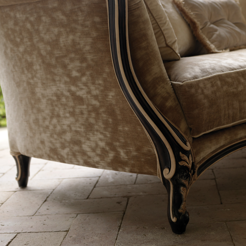 In a hand painted black finish with gold details and upholstered in a rich velvet fabric. Height 105 x width 162 x depth 125 cm. Available to order in alternative fabrics, customers own fabric and finishes. Prices will vary. Seat cushion in feather or memory foam, price available on request. Cushions are available, but not included in the price.