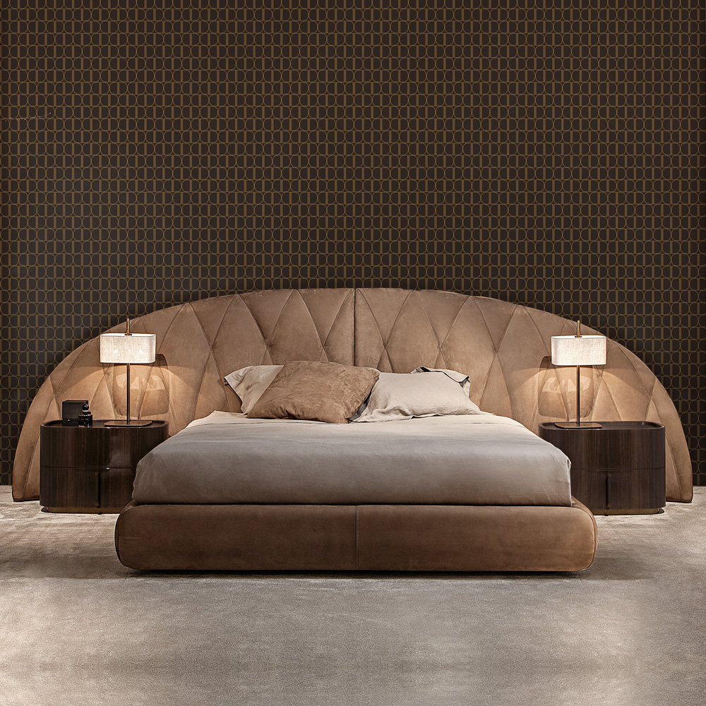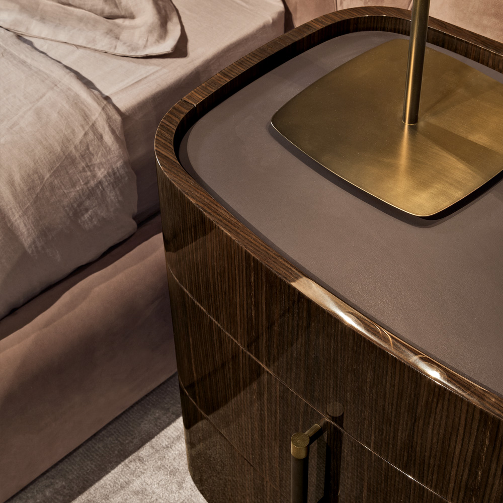 A wooden structure with sleek curves is finished in a dark walnut glossy veneer casting a luxurious presence. Available with two or three fabric lined drawers as shown, one hidden – with soft metal runners for effortless closing, are embellished with handles in brass with a burnished brass finish. A leather finished top adds to the overall feel, and completes the design. In 2 sizes as standard, 3 drawers – height 66 cm x width 70 cm x depth 48 cm, weight 56 kg. And 2 drawers – height 50 cm x width 70 cm x depth 48 cm, weight 35 kg. Available in alternative veneers and lacquers, leathers and fabrics including customers own. Prices will vary. Marble top also an option, weights will increase. A larger tall chest of drawers in the same design is also available, creating a fabulous collection.