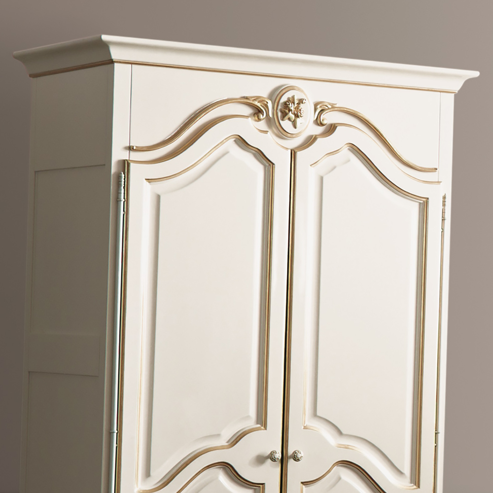 White Louis Reproduction Two Door Armoire. This super armoire belongs to an enchanting collection offering romantic charm and elegance. Made from solid cherry wood and finished with a luxury white high gloss lacquer. The beautifully shaped carved doors, separate bottom drawer and small cabriole legs are superbly complimented with gold leaf outlines creating a most elegant style indeed. This lovely collection, as shown here, also boasts an exquisite upholstered bed, bench, dressing mirror and bedside table providing a superb whole bedroom design.
